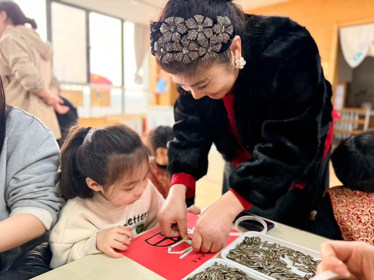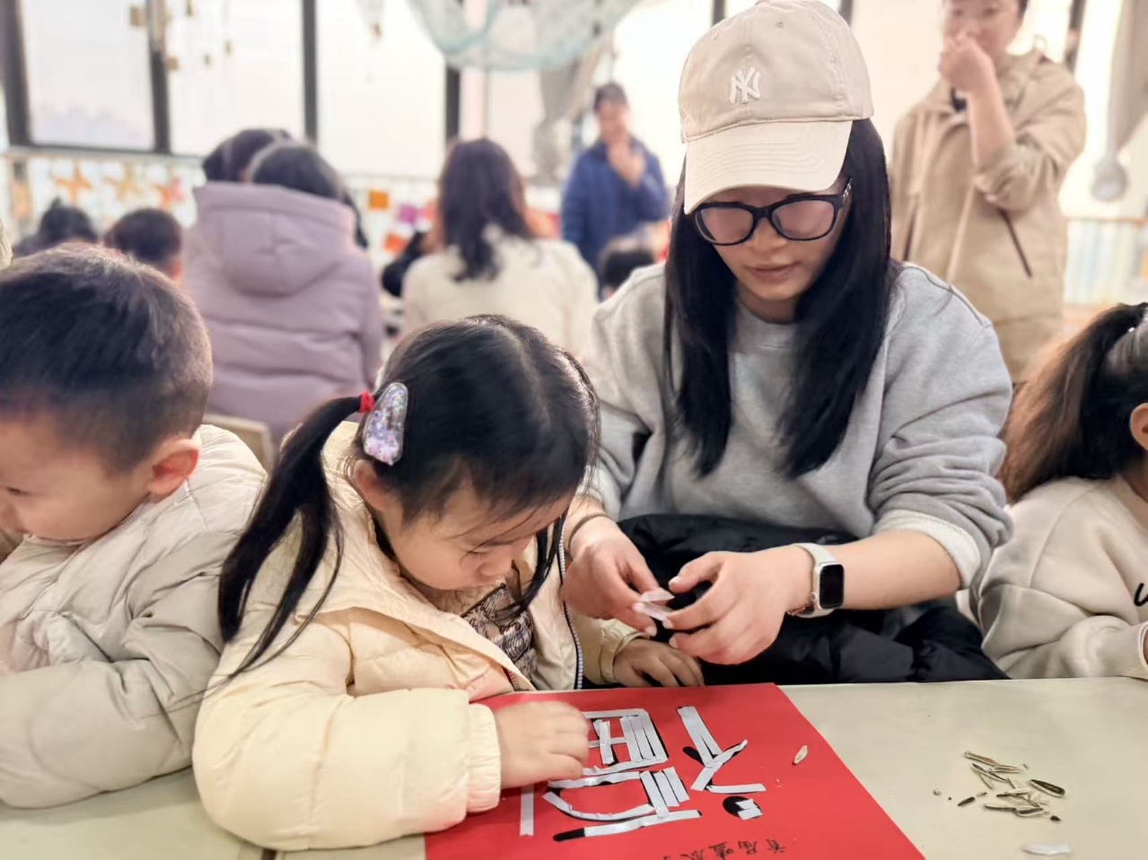 学期末的汇报活动,是幼儿园里最热闹、也最温暖的日子。这一天,爸爸妈妈们走进教室,坐下来,亲眼看看孩子们一学期的成长。唱歌、跳舞、游戏展示……每一个环节都精彩。但今年,有一个特别的环节,让所有人都慢了下来——亲子嗑瓜子,用瓜子仁拼出一个“福”字。