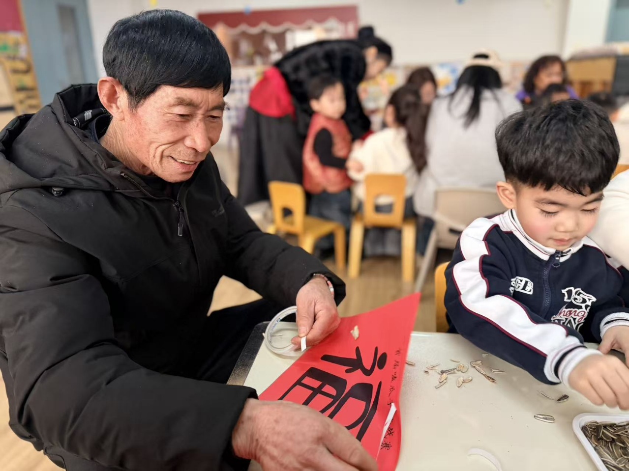 金灿灿的瓜子仁,衬着大红的底色,在阳光下闪闪发光。不是印刷体,不是书法家的墨宝,是孩子们一粒一粒亲手拼出来的“福”。这份福气,比任何买来的都要珍贵。