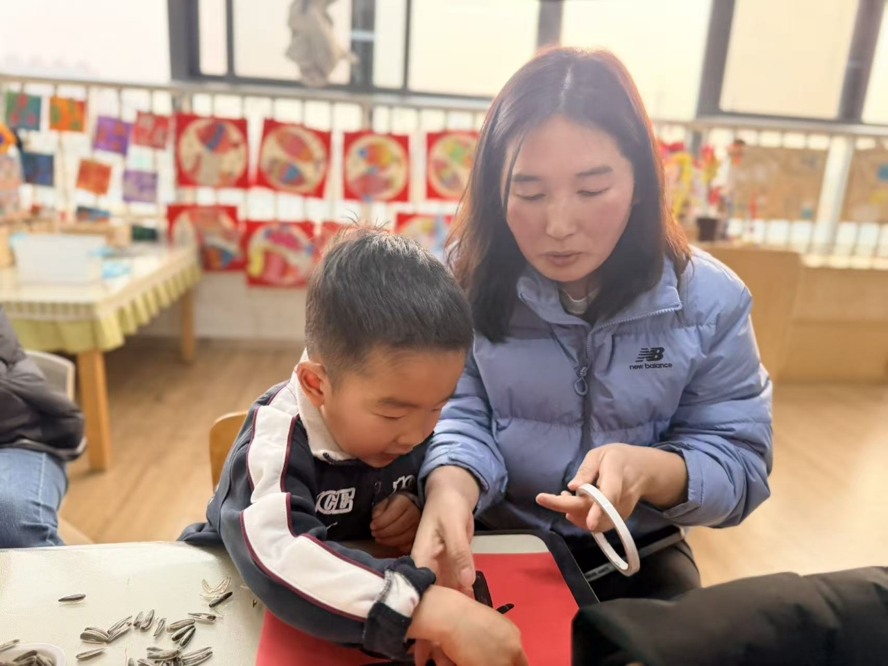 小手捏着小小的瓜子仁,轻轻地、稳稳地放在指定的位置。每一粒都像一个小小的“点”,一点一点,连成了横,连成了竖,连成了撇和捺。
