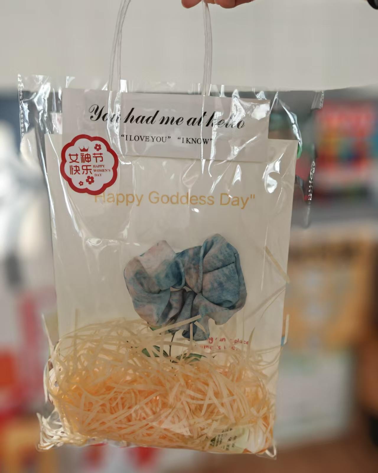 孩子们认真地将发圈和护手霜装进小布袋里。装好后,他们还用小手轻轻按一按,检查是否装得整齐。有的孩子偷偷在袋子里塞了一张自己画的贺卡,有的在袋子上贴了一朵小花。每一个小动作里,都藏着孩子对妈妈、奶奶最细腻的爱。