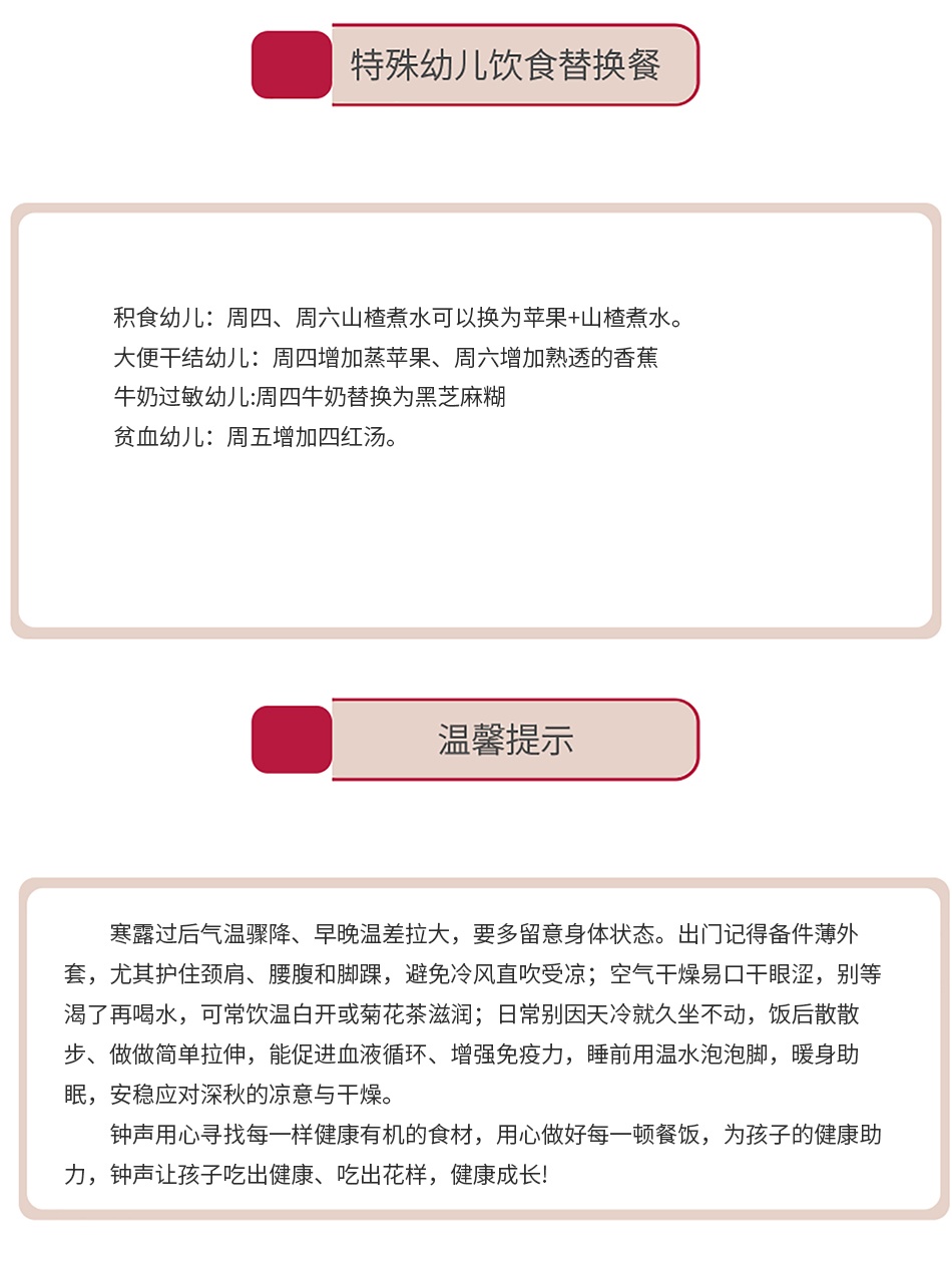“寒露惊秋晚,朝看菊渐黄。”寒露节气过后,气温下降,空气干燥,正是孩子们需要润燥生津、养护脾胃的关键时期。我园始终秉持“食育即育人”的理念,根据节气变化和幼儿生长需求,精心制定了本周的寒露专属营养食谱。让我们通过一碗暖汤、一份主食,将关爱融入孩子们的一餐一饭中。