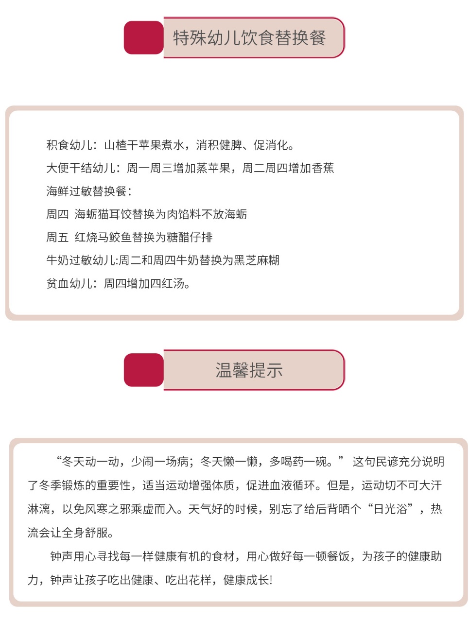 钟声用心寻找每一样健康有机的食材,用心做好每一顿餐饭,为孩子的健康助力,钟声让孩子吃出健康、吃出花样,健康成长!