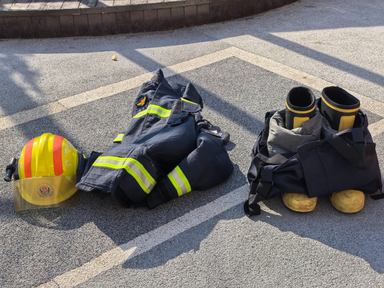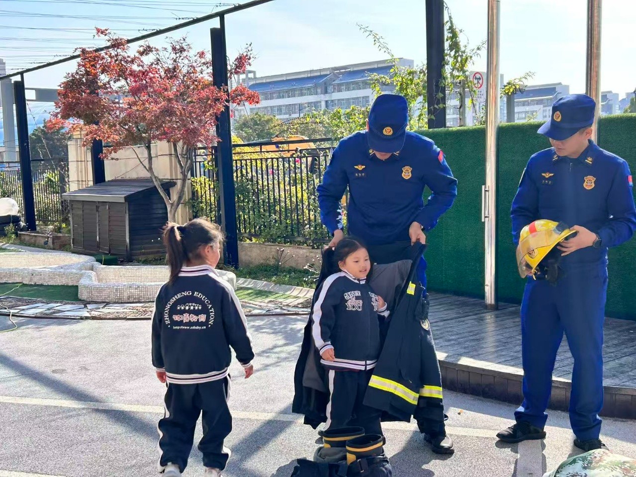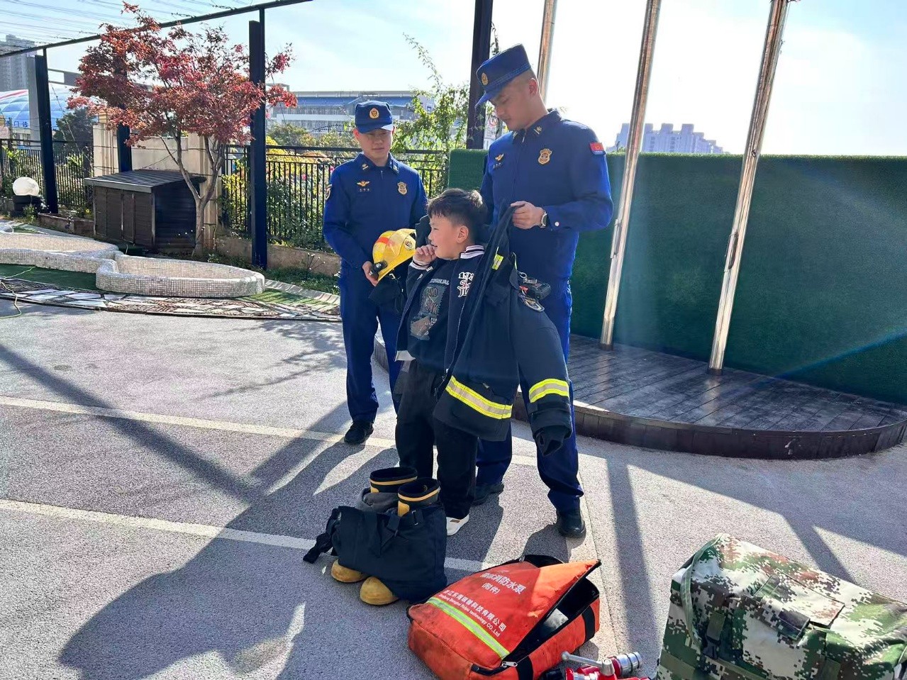 在消防员叔叔的指导下,孩子们穿戴上了消防装备,亲身体验当“小小消防员”的感觉。一双双小手轻轻抚摸着装备,感受着这份别样的新奇。