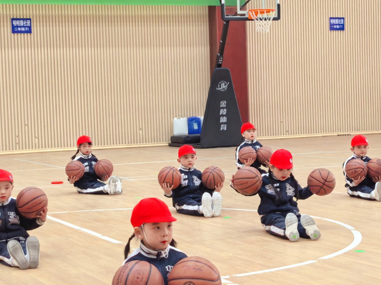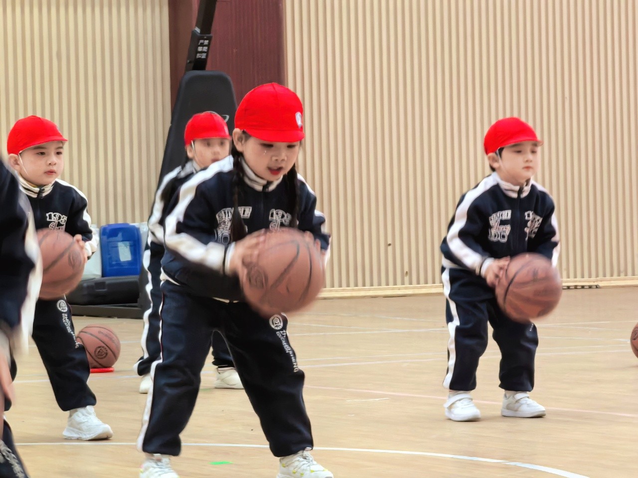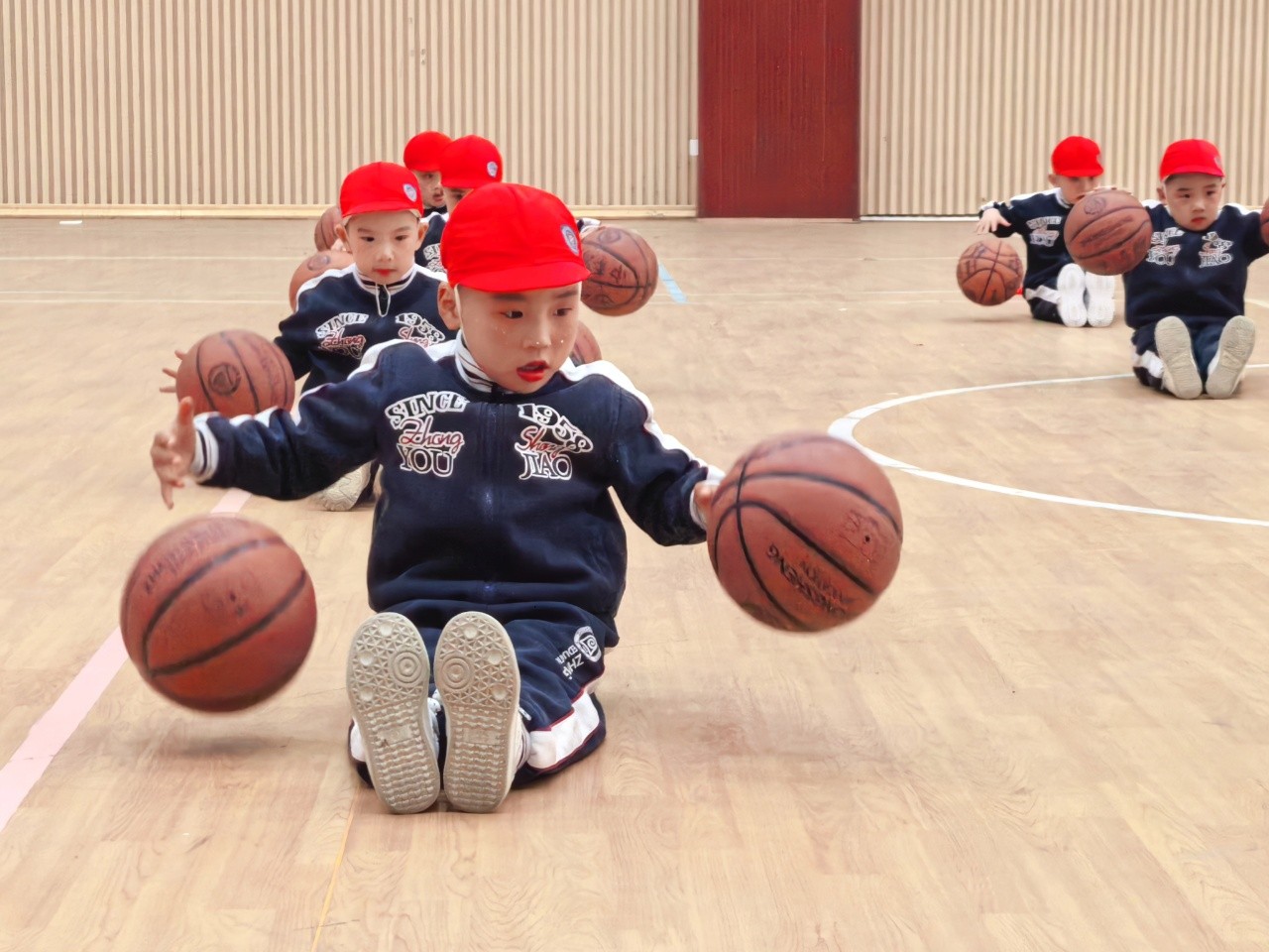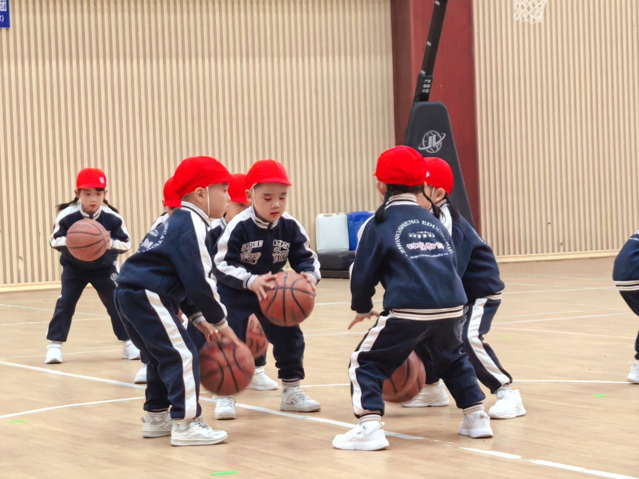大班的孩子们时而变换队形,时而变换拍球方式,动作有模有样,充分展示了篮球与音乐、体育与游戏的相互融合。动感的音乐、跳动的身影、变化的动作,认真的神态,真是太棒啦!