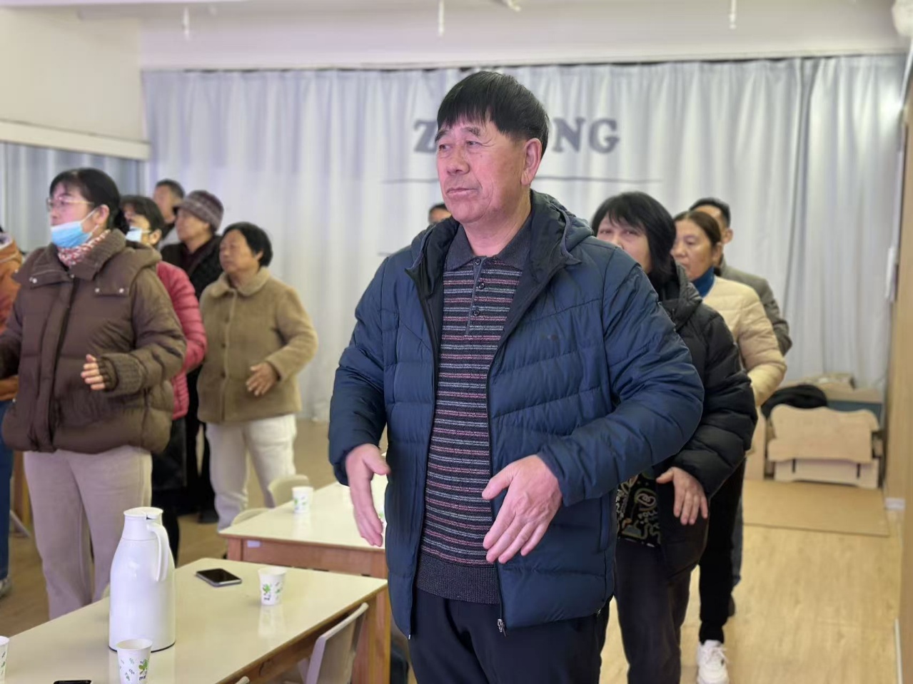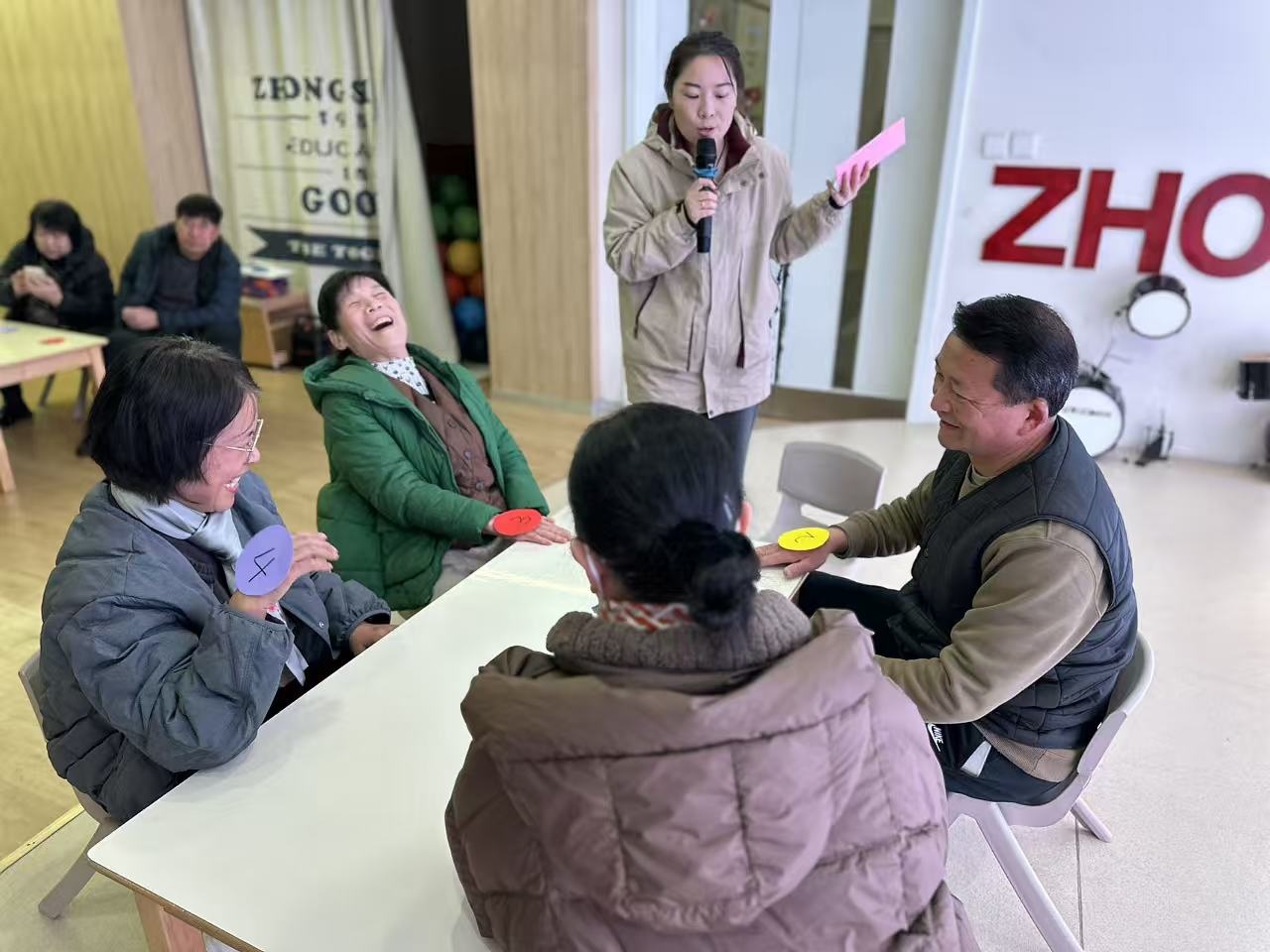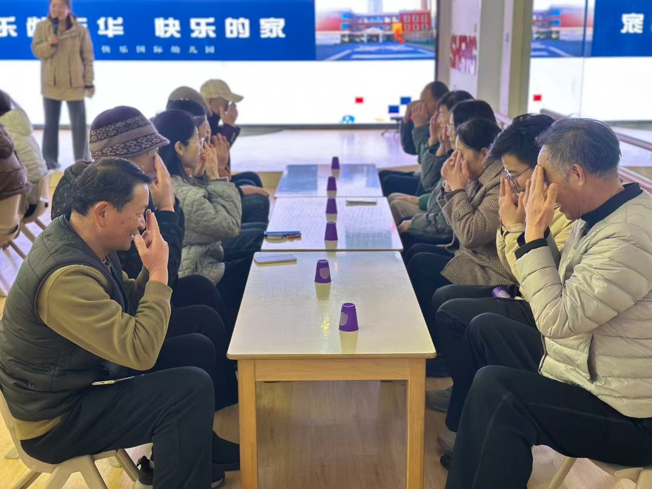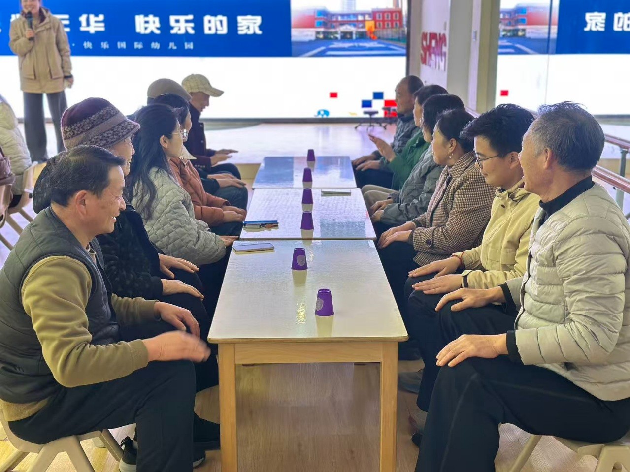随着热身结束,活动进入了轻松愉快的反应力训练环节。长桌上,彩色杯子排列整齐,一场专为长辈设计的“晨间大脑体操”即将开始。