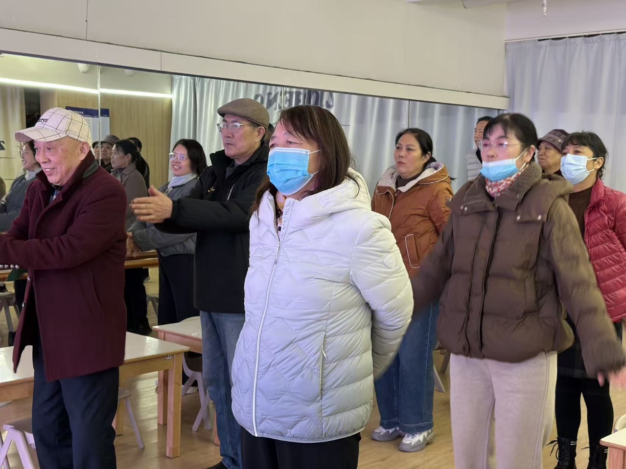 “请各位放松肩膀,想象自己像一棵在晨光中舒展的松树……”在柔和的引导语中,长者们开始了一系列针对肩颈、腰背的温和拉伸动作。这些动作特别考虑了长辈们的身体状况,每个姿势都提供坐式和站式两种选择。