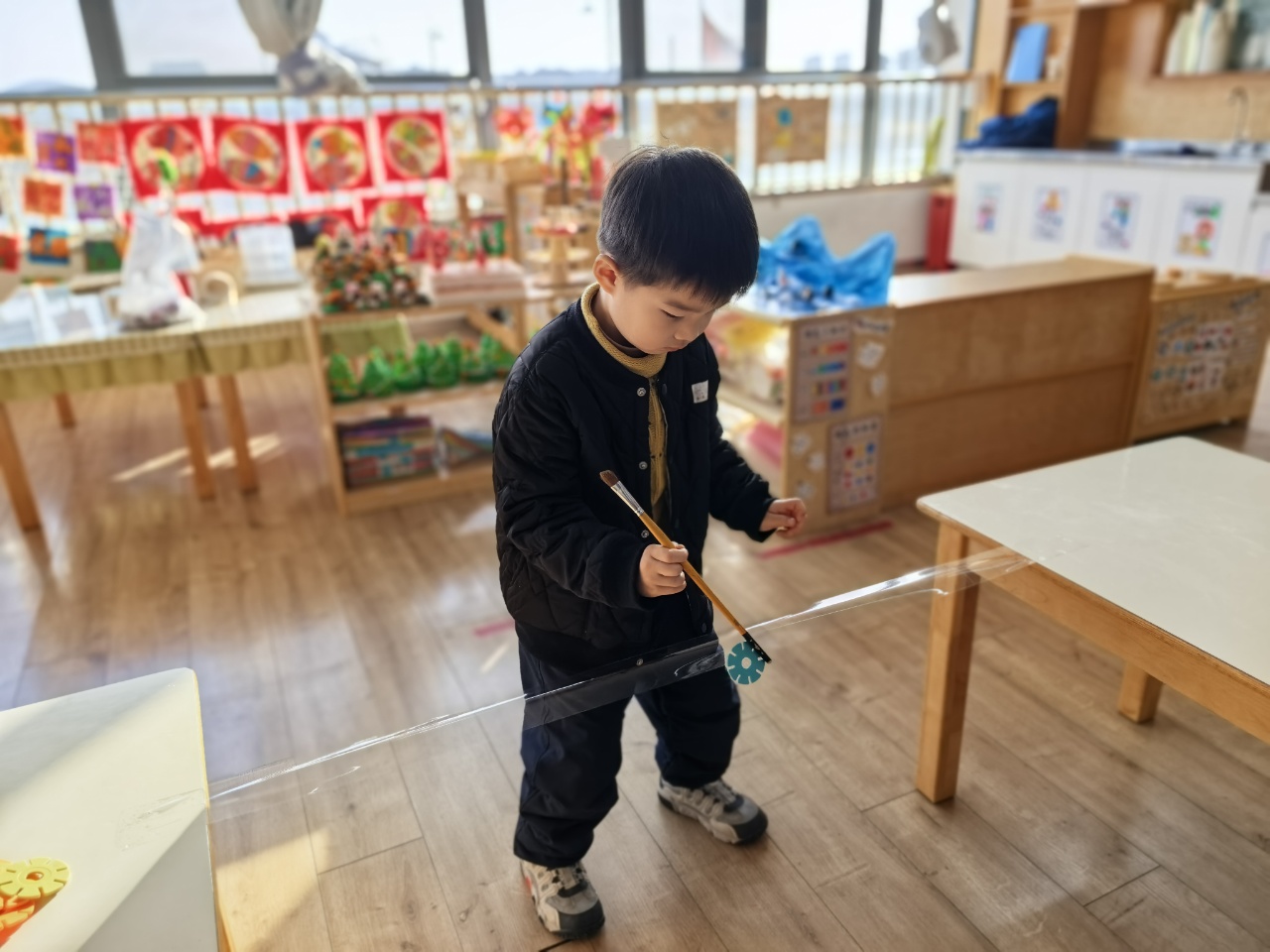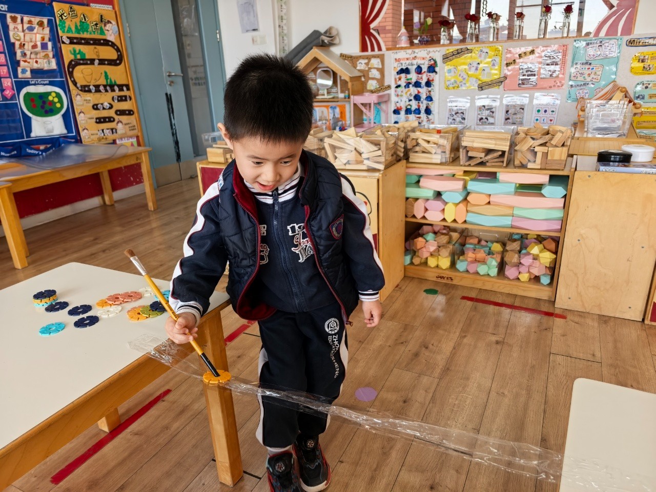 脚踩“独木桥”的,不是孩子的脚,而是他全部的视线和心神。他的世界在那一刻缩小了,小到只剩下笔尖的那一点,和胶带上那条笔直的“路”。同伴的声响,窗外走过的身影,都不再是干扰。他们的全部能量,都汇聚在指尖,用来对抗那看不见的“地心引力”和“平衡恶魔”。