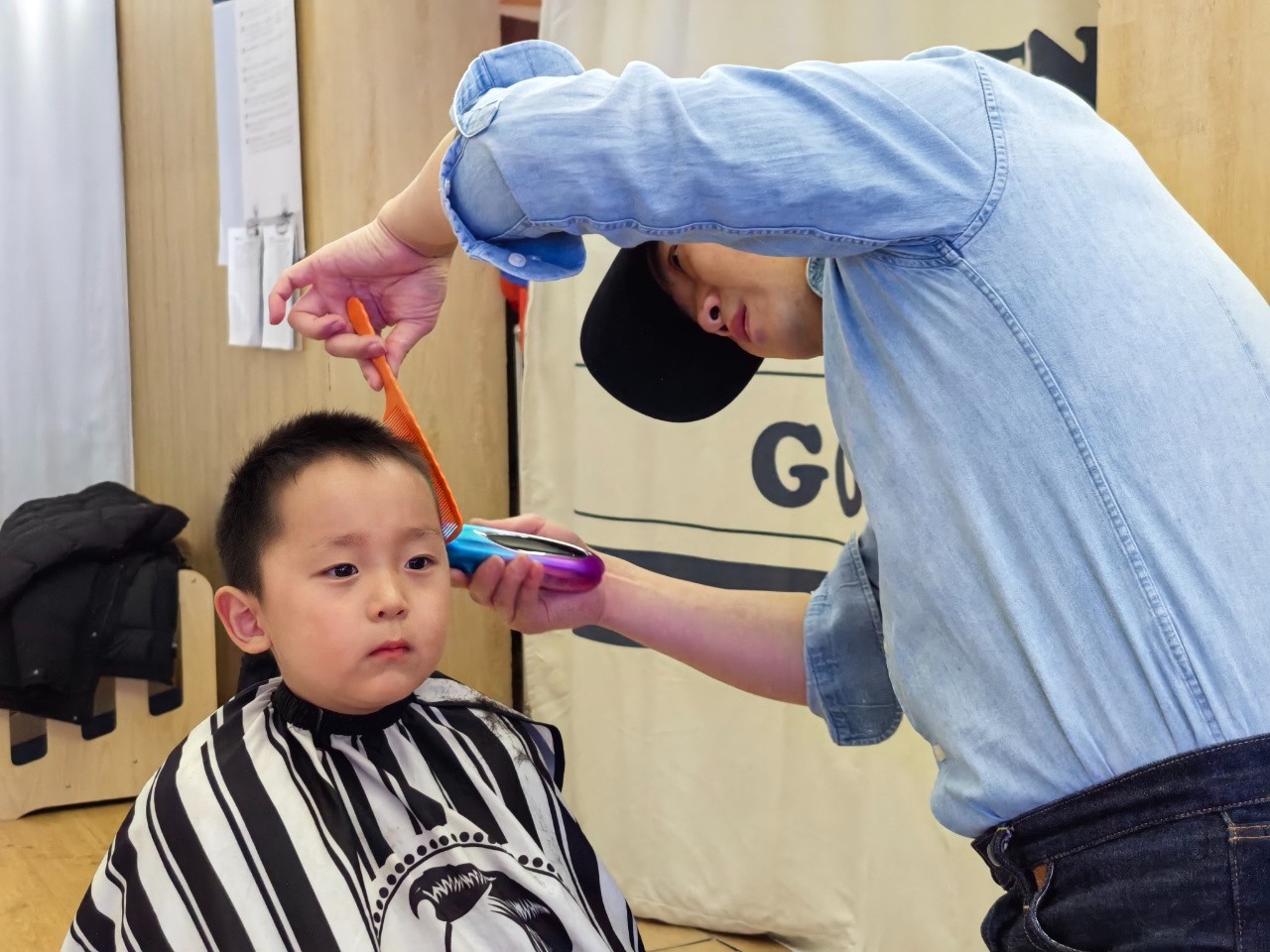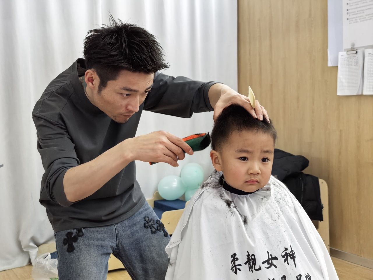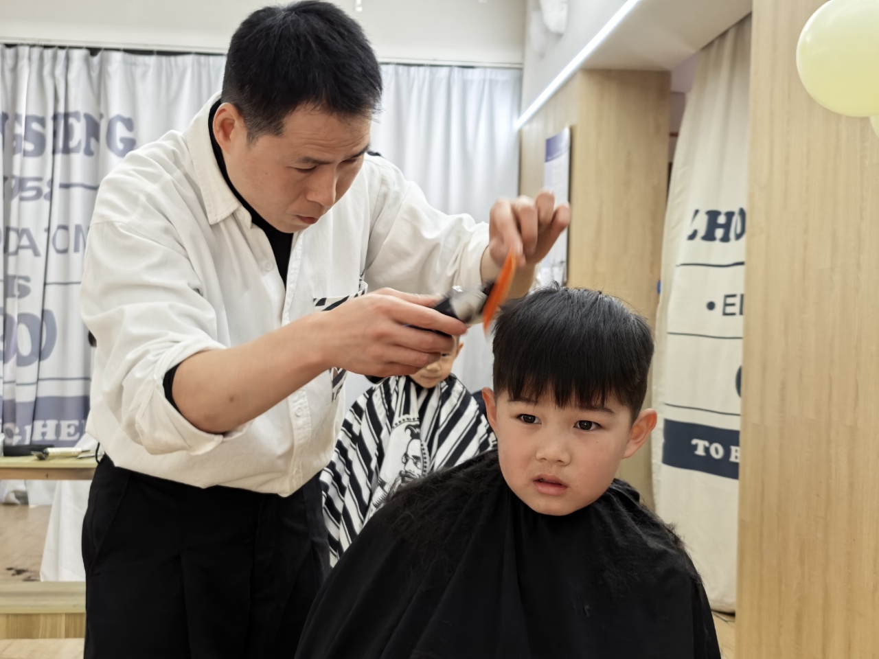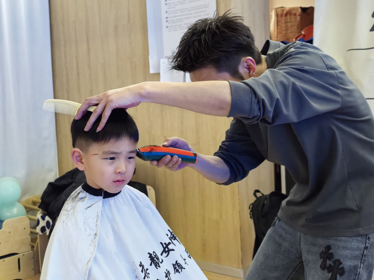 理发师叔叔动作轻柔、技术娴熟,一个个小脑袋变得清爽又可爱。有的宝贝勇敢端坐,化身“小绅士”“小淑女”;有的宝贝好奇张望,满眼都是对新发型的期待,享受着这份专属的春日仪式感。