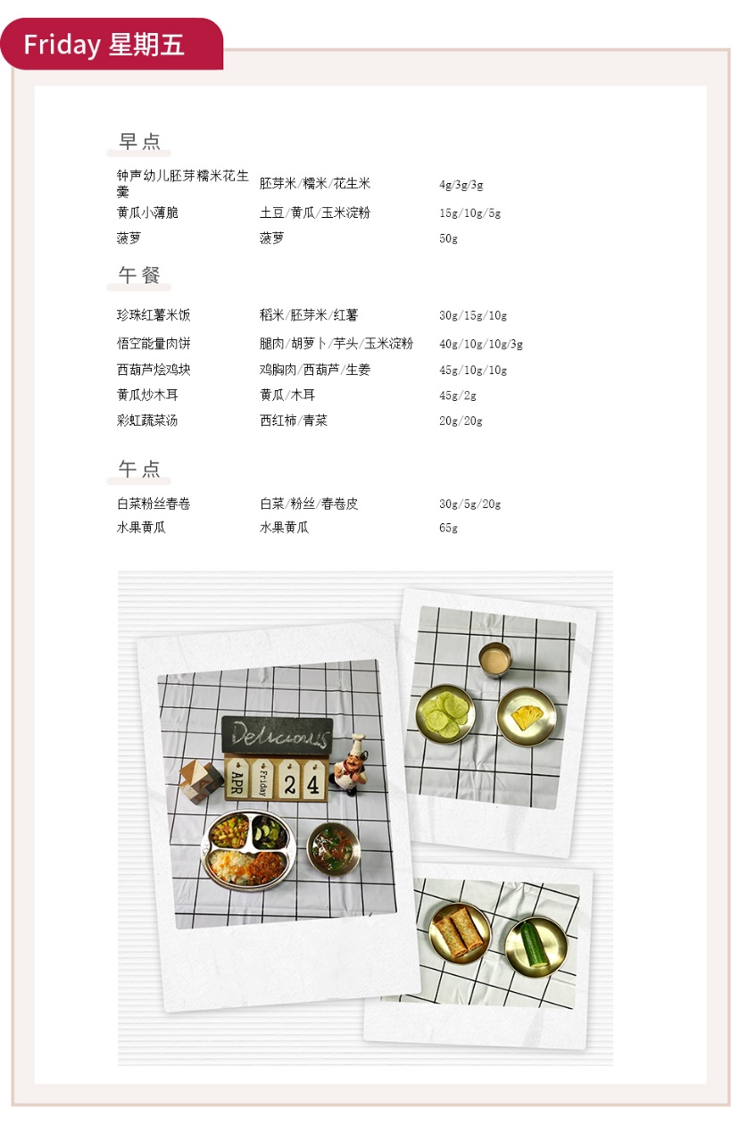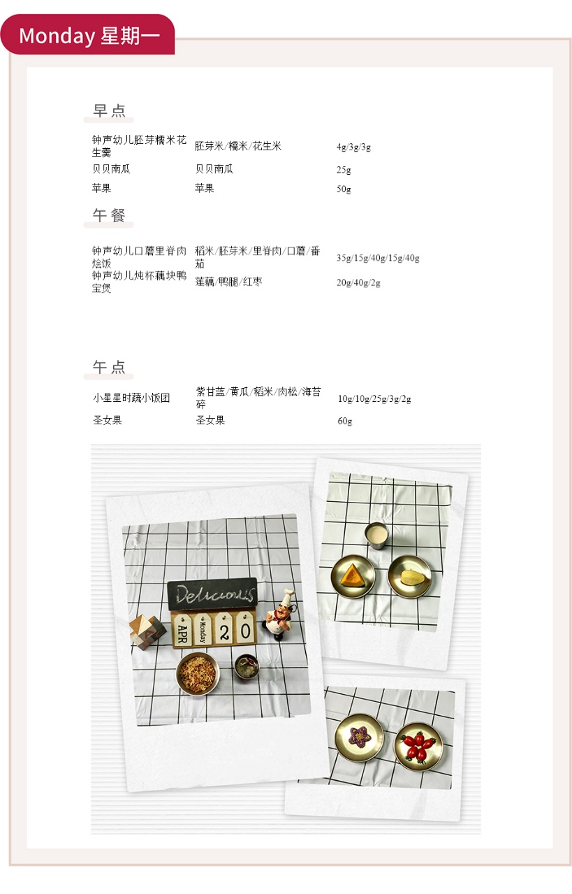 春风轻拂,美食相伴。钟声教育始终秉持科学膳食理念,用心搭配每一餐,让宝贝们在营养均衡的美味中,元气满满地拥抱幼儿园的每一天。本周,我们为孩子们准备了丰富多样的餐食,将五谷、蔬果、肉蛋、豆制品巧妙搭配,兼顾营养与趣味,用舌尖上的温暖守护宝贝的成长。