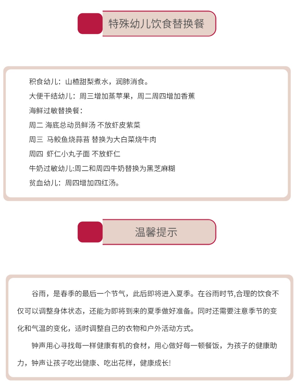 每一餐,都是我们对宝贝们的用心与关爱;每一道菜,都藏着我们对健康成长的期许。钟声教育将继续坚持科学膳食、营养均衡的原则,用心做好每一餐,让宝贝们在幼儿园吃得开心、吃得健康,在美食的陪伴下快乐成长!