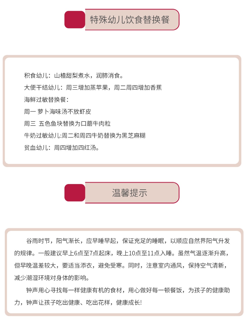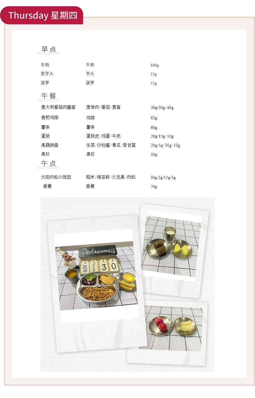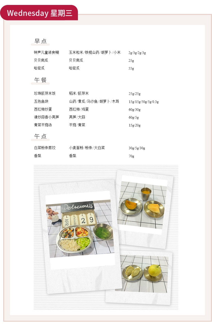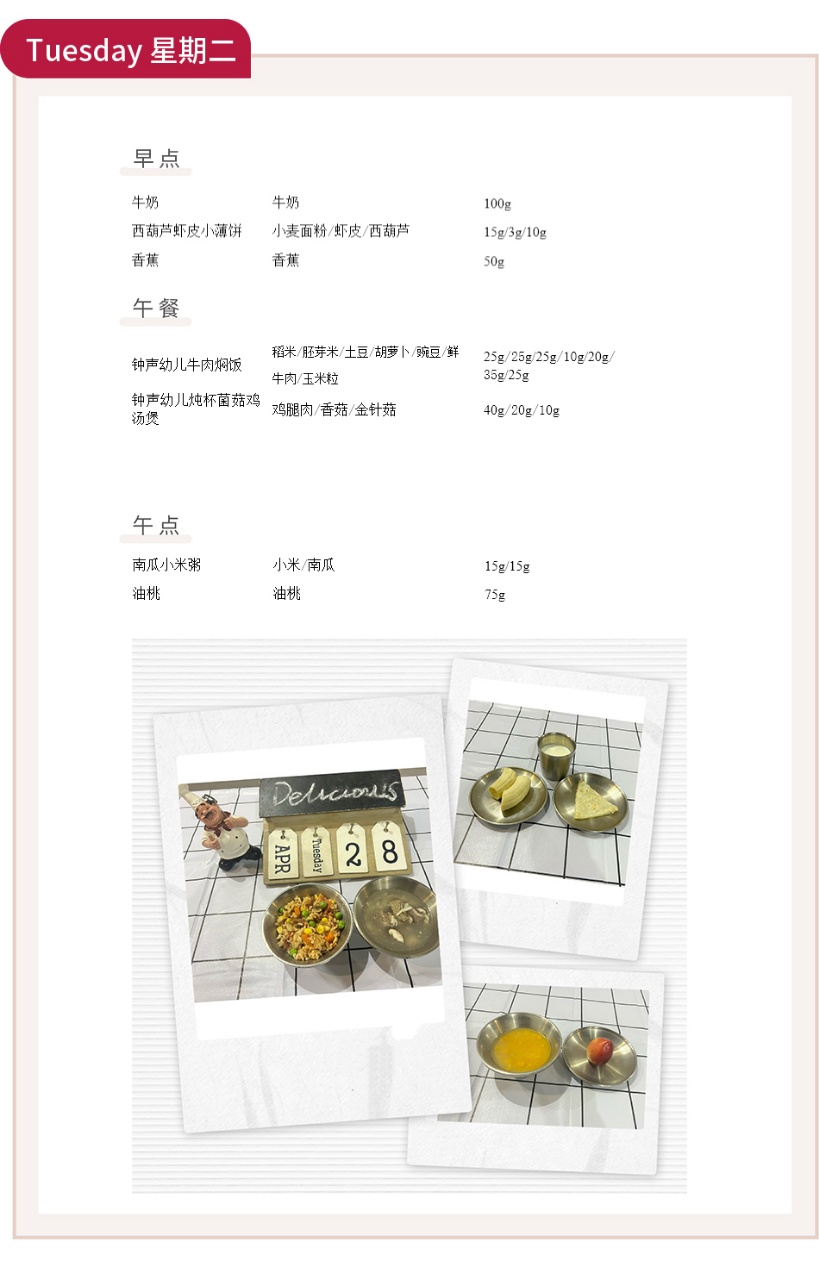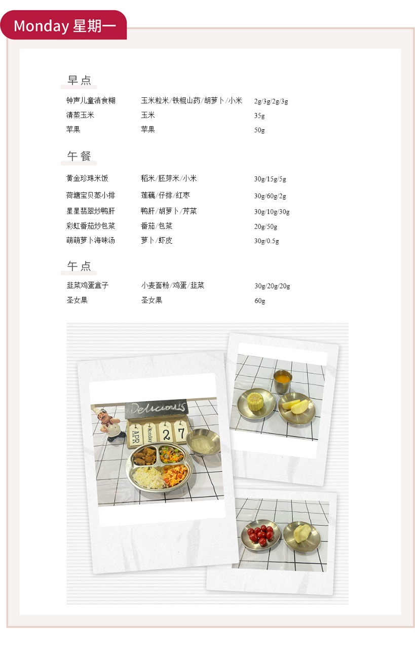 当春日的微风拂过幼儿园的窗台,厨房里的烟火气正为宝贝们准备着一周的惊喜。每天的早点时光,是唤醒宝贝味蕾的第一份温柔。午餐是宝贝们一天中最重要的一餐,我们坚持 “荤素搭配、粗细均衡” 的原则,让每一份餐食都营养满满。午后的小点心,是孩子们惬意时光里的甜蜜慰藉。